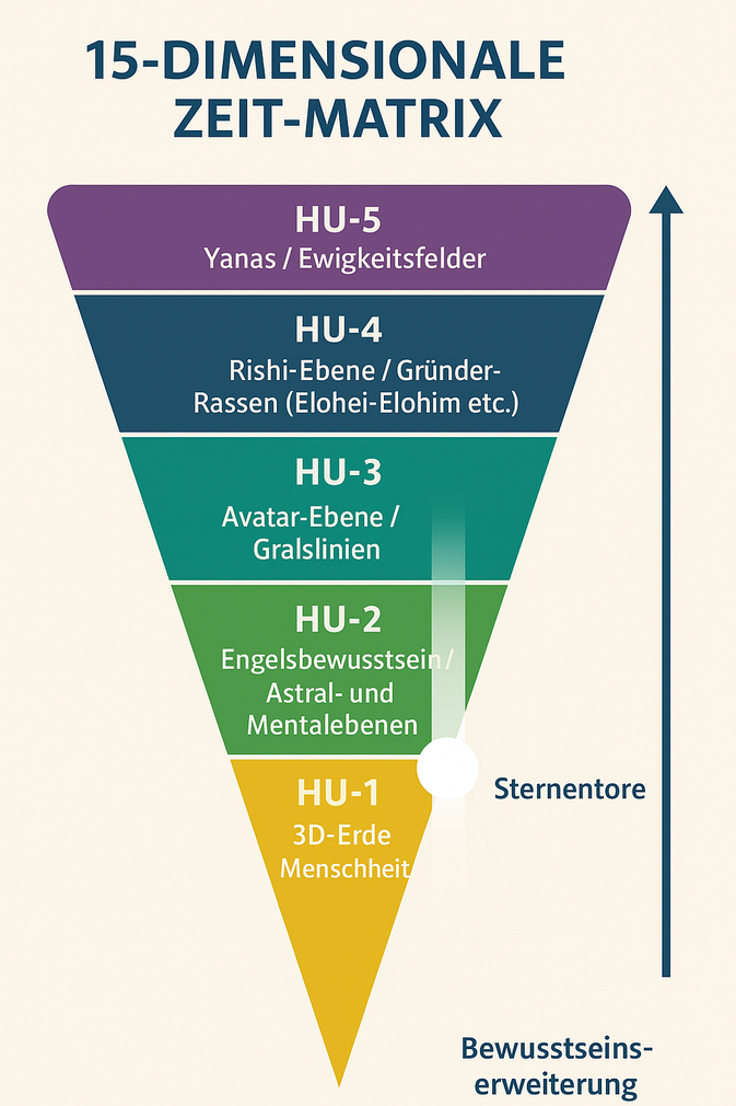 HU-4 | D10–D12 | Rishi-Ebene / Gründer-Rassen (Elohei-Elohim etc.) | Hohe schöpferische Intelligenzen, Lichtkörperwesen, multidimensionales Kollektivbewusstsein. |
