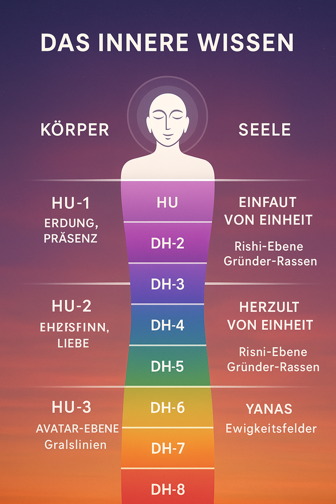 HU-3 | D7–D9 | Avatar-Ebene / Gralslinien | Reines Christus- oder Kristallbewusstsein. Hier beginnt die bewusste Co-Schöpfung. |